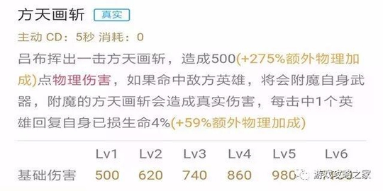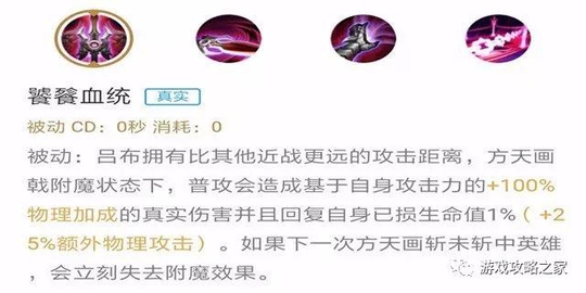 技能解析:吕布挥出方天画斩,命中敌方英雄附魔武器,附魔状态下能造成真实伤害,击中敌方英雄回复自身生命值。180°超大超远的技能范围,保证了命中率,技能前摇明显却可以通过走位调整技能位置,是一个简单粗暴的技能。