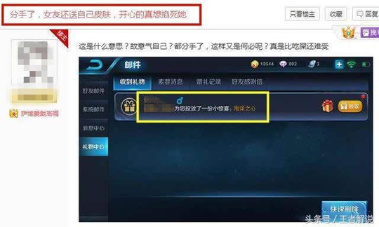 该玩家最后也表示,为什么前女友送自己海洋之心,自己非但不高兴反而觉得很生气呢?因为自己根本就没有武则天,自己玩游戏基本上就没充过钱,更不要说说武则天这么贵的英雄了,自己根本没有。而女友却送了一个武则天的皮肤给自己,这分明就是侮辱人啊。