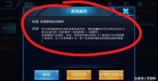 这名诸葛亮玩家在游戏中打了一句话“后羿的狗年皮肤大招是不是一条狗”紧接着下方就出现了王者荣耀黄色的检测警告提醒,检测到了诸葛亮的言语辱骂行为,但是诸葛亮的聊天消息并没有任何的言语辱骂,游戏内提示就算了,结果出来之后系统邮件就来了,显示扣了3分的信誉积分,累计扣到15分就会禁赛封号了。