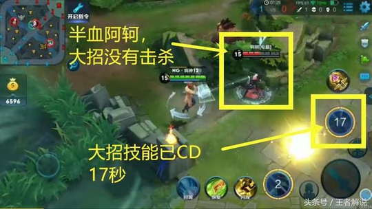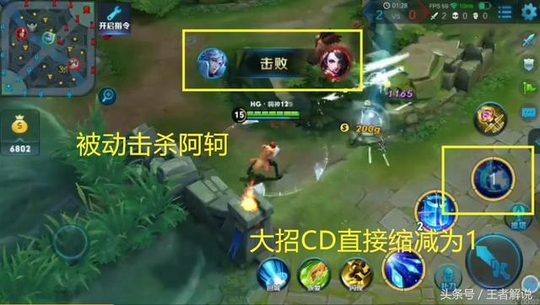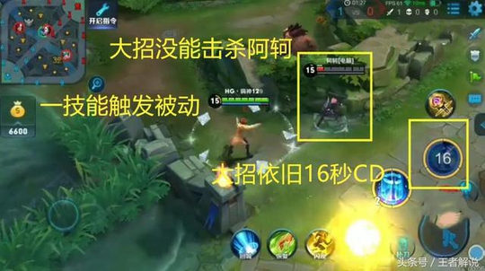 这是王者解说在实战中发现的,然后在训练营中测试了很久才摸清整个套路。首先,诸葛亮的大招在面对半血的阿轲时并没有直接将阿轲击杀,如果是在以前,诸葛亮的大招是绝对不会缩减CD的,因为没有达到直接击杀的要求。而此时诸葛亮的大招也是没有CD缩减的,不过我们在接个一技能触发一下被动伤害。