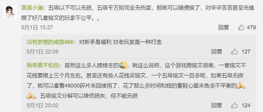 有支持的声音就有反对的声音,很多老玩家不干了,认为这样做对新手来说是福利,对老玩家而言却是打击。因为这对辛辛苦苦攒了多套铭文的老玩家极度不公平,很多老玩家从S1玩到现在,参加各种活动,每天打满熟练度,就是为了快速攒齐铭文。可以说,为了配齐一些常用英雄的铭文,这些玩家花费了不止一年,很多还充了很多钱。但是现在一夜回到解放前,新手只要拿着30个五级铭文就可以来回使用了。