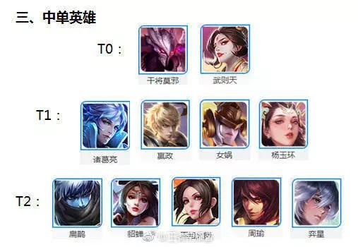 再来看看中单英雄,中单TOP级别是2个手都很长的法师,干将莫邪在重做之后又回到了中单一哥的位置,但是这个英雄的操作难度还是非常高的。而诸葛亮、嬴政、女娲、杨玉环这些T1级别的中单也是不错的上分选择。