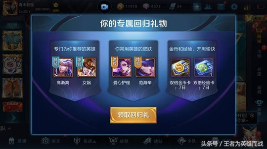 全新的老玩家回归活动是非常给力的,送的可是永久英雄,天美可算是良心了一次,这样一个力度对于老玩家回流来说吸引力还是挺大的,毕竟永久英雄可不容易得啊,如果只是靠平时打金币来算,一周也只有4000多金币,一个月才能买一个英雄,这么换算过来的话,好像弃游获得的金币并不比一直玩要少啊。