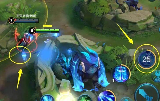 如上图,诸葛亮释放元气弹大招后,百里玄策这时候已经非常残血,但是百里玄策并没有被诸葛亮的元气弹直接秒杀,而这时候的诸葛亮刚好叠满被动,有5颗法球围绕诸葛亮身边转动,同时,诸葛亮的大招CD这时候是25秒。