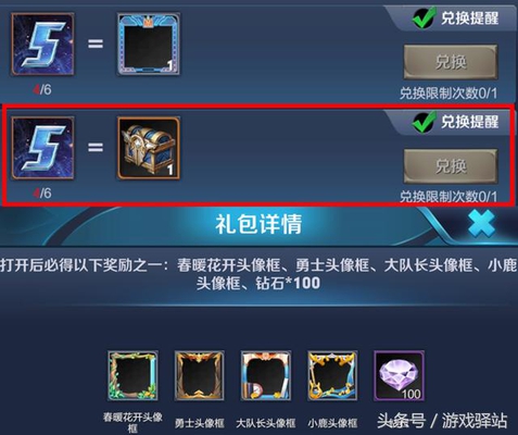若提前拿到55开黑节头像框的玩家还可以在明天用召集令兑换头像框宝箱(具体获取攻略可以查看小编早前的专题介绍),四款头像框分别为春暖花开、勇士、小鹿和大队长,若全部拥有则开出100钻石!