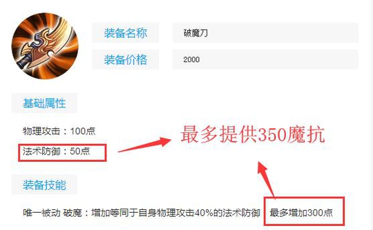 唯一一件既加魔抗又加物理攻击的装备,要知道魔女斗篷魔抗才加360而这件破魔刀加350。自己又要想打伤害又要提高自己的生存能力,就可以出破魔刀来 针对对面有高爆发法师干将莫邪、高渐离 。