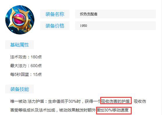 战士有血魔之怒,法师则有炙热支配者。兼具回蓝、保命、法强加成的冷门装备,这么多好用的属性为什么出的人很少呢?就是因为该装备太全面了,法术加成的伤害不高。但是在某些特殊对局中出效果不错,比如:对面有兰陵王、猴子、多个突脸英雄每次都针对你的时候可以出,护盾的减伤配合移速的加成绝对能保住你的小命;己方打野不让蓝自己又非常缺蓝的情况下就可以出。这件装备非常