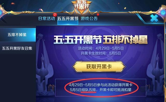 第二点 开黑卡是需要在五排失利的情况下才会自动激活的,如果你是单排或者三排那么这个开黑卡可能就不会自动激活哦,为什么这么说我们可以从所有的五五开黑卡的活动界面看到,如下图红线标注的地方,组队五排,还有上图红线标注的地方,都写明了需要五排才有效。