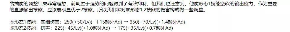 这次的调整增加了虎形态一技能的伤害,降低了二技能的伤害,总体伤害变化不大,但考虑到虎形态下一技能是主要输出技能,算是一波非常非常小的加强吧!(或者说是对上次削弱的补偿?)