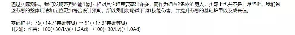 让苏烈更像一个坦克的改动,但是我感觉输出流的苏烈可能会更强了……因为变肉了很多,但伤害的削减并没有影响到根本。