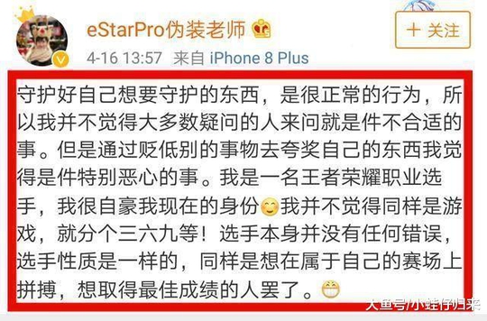 Estarpro伪装老师看了网友评论后,也发表了自己的观点。骚狐君很是赞同,先不说网友能将一个ID炒到王者荣耀和英雄联盟这两个游戏怎么怎么样问题,从任何游戏一款来说,都应该是平等的,不能因为一个是端游,一个是手游,就瞧不起谁,只能说,各有优势。