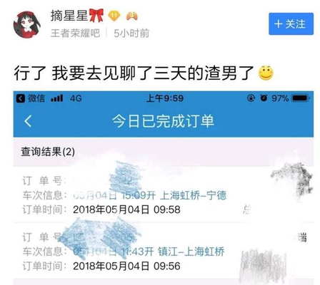 今天小编在浏览荣耀吧的时候偶然间发现了这个帖子,帖子的楼主就是今天的这个主人公——网恋少女。她在帖子中表示自己要去见王者荣耀中的男友,从她晒出的车票可以看出,他们相距还是蛮远的,虽然奔现很正常,距离也不是问题,但是令我感到吃惊的是,她竟然只和cp男网恋了三天就选择了奔现!