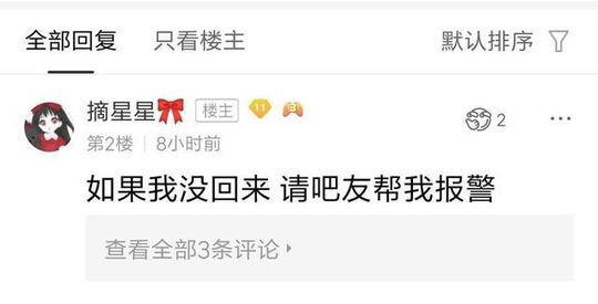 “如果我没回来,请吧友帮我报警。”看来,她还是对于这次奔现有点不放心的,但是既然票已经定了,估计她也不会反悔,虽然网恋并不是有人想的那样恐怖,奔现也有很多成功的,但是小编还是要说一句,女生独自出门毕竟有点危险,而且她还去了那么远的城市,所以还望她平安归来吧。