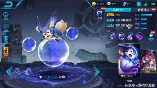 梦奇是前段时间刚出来的一个新英雄,刚出来就被列入到了身材最矮行列里面也是很尴尬了。这个时候又会有人说了,梦奇圆圆滚滚、胖胖乎乎身材大的啊,怎么会矮小呢,我们这里按照该英雄没增大身体体积之前进行分类的。大家可以看一下没有变大变胖之前的梦奇的身材,可以说是很矮小了,和身边的气泡差不多的高度,说梦奇矮是有理有据的,接受这个无法承受的事实吧。