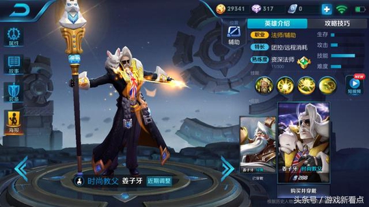 最不服老的英雄大概就是姜子牙了,一大把年纪还把自己打扮的如此时尚,帅气的刘海加上黑色墨镜,再来一个黑色的披风,把姜子牙打扮成了明星,和刘备一样的是,姜子牙的肩膀上也有一个宠物,一只白色的小狐狸,这大概是峡谷中最美的宠物了吧!