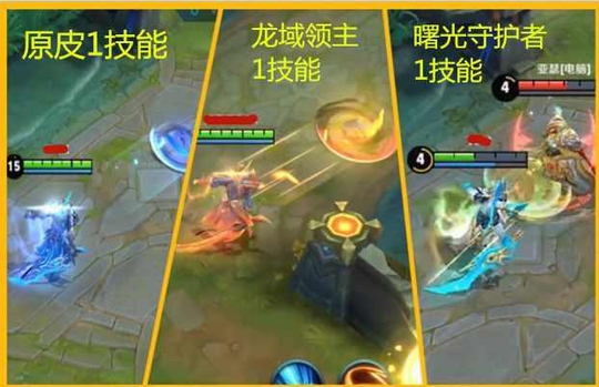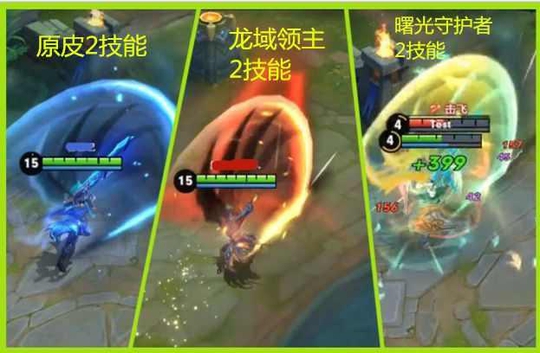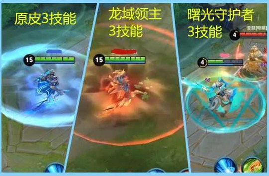 如上图,在特效上,变身后的铠,3款皮肤的1技能看起来都差不多,仅仅是颜色上有变化而已,原皮主要是蓝色,龙域领主主要是红色,不过曙光守护者的技能特效颜色跟本体的青色不一样,而是淡绿色,带着一点点黄。