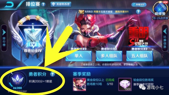 二:勇者积分翻倍,就是那个段位保护积分,达到一定的积分后会自动开启保护,当你段位没星了以后,如果正处在段位保护,会扣除勇者积分,帮你抵挡一次扣星,从5月5日17:00到晚上22点整,这个时间段参与排位比赛,勇者积分都会翻倍增长,不管你是单排、双排、还是多人组队,都可以翻倍增加勇者积分。