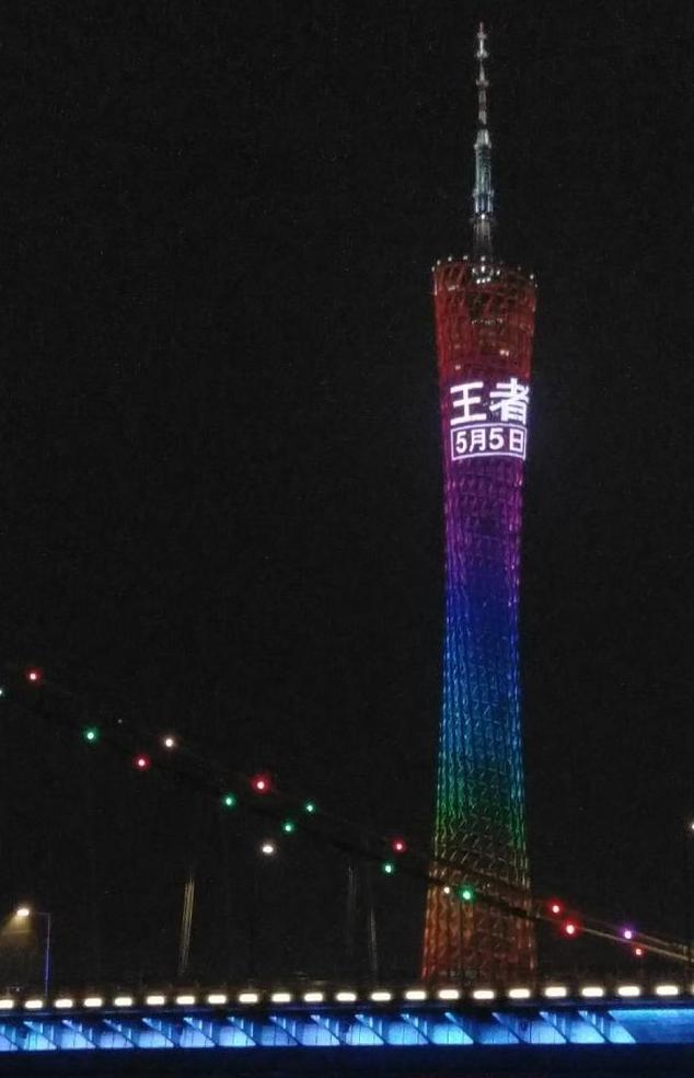 今年王者荣耀不仅邀请五月天作了一首主打歌,并且下了大手笔在中国第一高塔-广州塔上打了一波非常酷炫的广告。“王者荣耀,5月5日来五排开黑”的字眼在广州塔上方旋转,显得异常的显眼!
