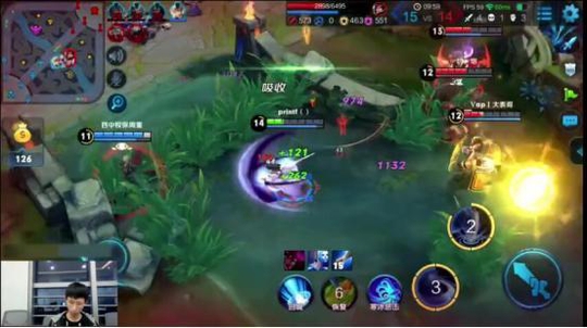 这时候敌方的张飞和达摩赶来梦泪瞬间进入三人的围剿当中,这时候梦泪不慌不忙。显示,一个一技能+大招拉开距离。进入草丛,让敌方丢失视野,同时等自己的技能CD好。