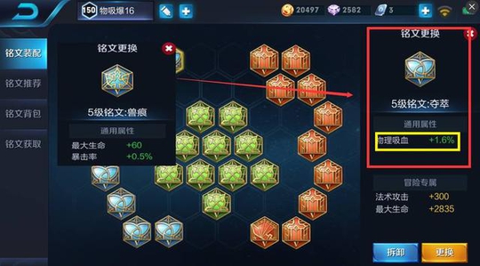 反而将蓝色铭文更性为夺萃后,整体上增加了16%的物理吸血效果,而吸血效果对于集刺客和战士于一身定位的猴子来说,这是必不可少的属性。当铭文作出了不同的选择后,猴子选择另外这套铭文时,整体属性提升了7%暴击率和36%的暴击效果,增加了9物理攻击力和64物理穿透能力,但是吸血效果增加了16%。猴子在选择之套铭文时,出装的选择上将会更优于系统的原配出装。