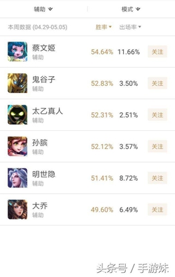辅助榜是曾经的钻石局常禁英雄蔡文姬,蔡文姬有非常恶心的控制技能,同时也有强大的回血效果,能够成为胜率第一的辅助英雄也是当之无愧的。