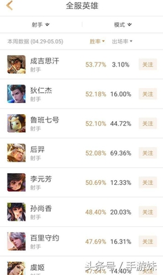再来看射手榜,之前一直都是后羿稳坐第一位置,但是现在是成吉思汗处于射手的胜率榜第一,但是我们再看一下后羿和鲁班的出场率,两个相加起来简直就已经接近100%了,可能很多王者荣耀玩家都不曾想到,竟然会有一天这两个被很多玩家喷的英雄会有那么高的热度!不得不说射手榜还是非常亮的,一直被认为不行的射手现在都成功的排在前列,而传统的比较秀的射手似乎都不太ok!