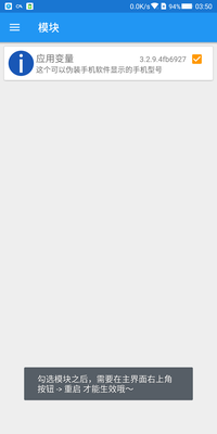 下载完成后将应用变量安装到VirtualXposed,打开软件内的Xposed lnstaller,左上角点击模块找到应用变量并勾选