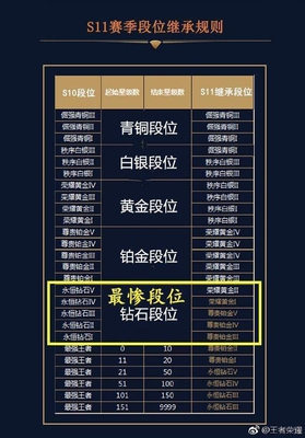 S11赛季的段位继承与S10赛季稍微有些区别,越是段位高掉段越多,青铜白银段基本上变化不大,铂金大多是掉成黄金,钻石段位掉星最多,钻石V能够掉到黄金Ⅱ,钻石Ⅰ掉到铂金Ⅲ,最强王者150星以上最多才能继承到永恒钻石Ⅲ。