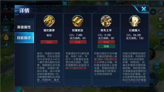 一技能:双重射击,刘备释放技能增加自身的移动速度,下一次普通攻击会变为两次连射。每颗弹丸都能对敌方造成不俗的物理伤害。