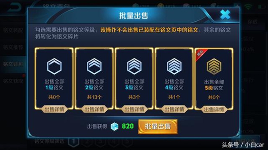 铭文是通过铭文碎片购买得到的,通过购买一定数量的铭文来搭配我们喜爱的英雄。但是有时候买错铭文怎么办?如果铭文碎片不足的话,我想只能出售掉买错的铭文然后重新购买我们需要的铭文,但是天美系统坑人的地方就在这里,购买的铭文在重新卖出去是要打折的,一级的铭文还好些,购买和出售都是10铭文碎片。从二级铭文开始就要打折了,二级铭文购买需要25铭文碎片,出售只能得到20碎片,三级铭文购买需要100铭文碎片,出售只能得到80铭文碎片,四级铭文购买需要400铭文碎片,出售只能得到320铭文碎片,五级铭文购买需要1600铭文碎片,出售却只能得到800铭文碎片,可以看到越高级的铭文折损越严重,这对于需要四五级铭文的玩家来说就是重伤。