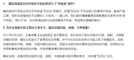 近日,针对此类负面信息,腾讯游戏在微博作出回应,并针对网友的不实言论进行辟谣。腾讯游戏表示,目前腾讯并未对任何手机机型进行“负优化”,所谓“负优化”不仅会极大伤害用户体验,影响产品口碑,同时会徒增很多不必要的人力成本。一直以来,腾讯都怀着尊重甚至是敬畏的态度来对待“用户体验”,我们不会,也没有理由进行此类损害各方利益,有违商业逻辑的操作。