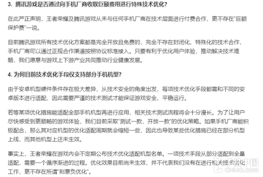 此外,腾讯还就“与手机厂商进行付费合作”,也就是我们所谓的“收保护费”进行声明。腾讯游戏称,目前王者荣耀团队以及腾讯游戏从未与任何手机厂商在技术层面进行付费合作,所有技术优化方案都是完全开放且免费的,完全不存在封闭化、特殊化的技术合作,手机厂商可以通过正规合作渠道按照协议标准接入。