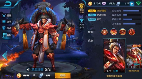 第四名张飞,开大之后张飞是变得非常的恐怖,变身之后的张飞,论防御和控制都是数一数二的,你想打也打不到他,变身后的张飞不但在撞开的道路上速度非常快,而且变身之后就连普通伤害都提高了。2技能和1技能的配合一定要打好,因为这个使用好了,相当于分割战场的作用,可以把脆皮推向我方,集火。