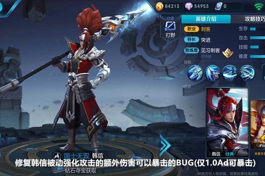 韩信主要是做了修复,将被动的全额暴击伤害调整为1.0ad可暴击。