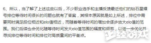 其实简单来说就是不仅要考虑段位,还要考虑一个叫ELO值的东西。这个数值由玩家当前段位中的胜率、胜场数和局内表现决定的。意思就是每次单排匹配到的都是ELO值类似的玩家。如果排位等待时间越长说明和其他玩家的ELO值差异就越大,这也是很多职业选手和主播匹配时间长的原因。现在你们知道为什么连胜之后总会连败了吧!