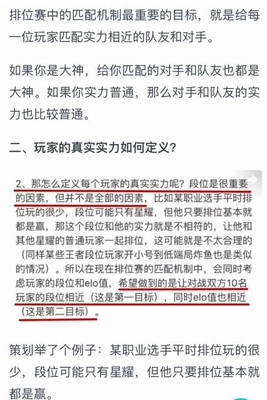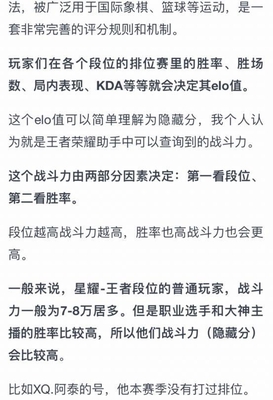 然后就是玩家的真实实力,除了和段位有关,还和一个叫做elo的值有关。这个elo值其实就是一套较为完善的评分规则和机制,关于这一点,王者荣耀游戏方其实是有一个较为严谨的算法的。