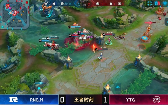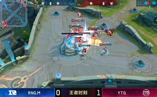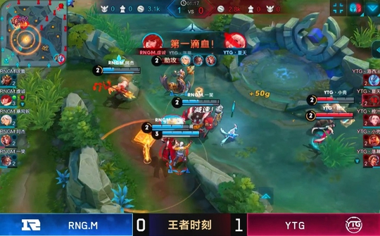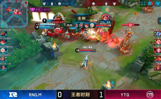 RNG与YTG的第一局,这时候的RNG前期是取得了优势的,击杀了YTG的公孙离以及张飞,2分钟不到就拿下两个人头,非常的凶猛,很多玩家都认为RNG要继续连胜下去了。