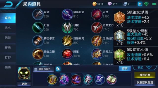虽然只是一个辅助,但还是推荐出全法装,这样才能对敌人造成大量威胁,出全肉的话,还不如选个白起呢,又打不出伤害,又扛不住,有什么作用呢?因此出装推荐上面这一套,只要对面稍微不注意,在炉子即将炸裂的时候,闪现上去,是能打出恐怖输出的!铭文则推荐梦魇+调和+心眼!