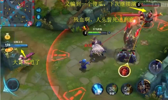 残血的敌人总是会吸引我们去补刀,在黄金段位以下的玩家都是这样的,见残血眼红,不打死誓不甘休,哪怕就是越塔都要追,这样做搞不好对面没追死,甚至容易追到敌人的陷阱里被干掉或者被塔打死。如果克制了这一点最起码能到钻石,如果这点都不你能克制,那么你也只能呆在黄金段位把。