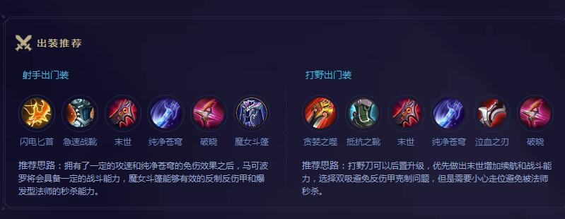 接下来看看装备,官方给了一套射手装和一套打野装。看来现在射手打野已经成为了一个常态,两套装备都是以攻速为主,第一套装备里面还有一个魔女斗篷,我个人觉得意义不是很大。两套装备都有纯净苍穹和破晓,看来这就是他的核心装啊。