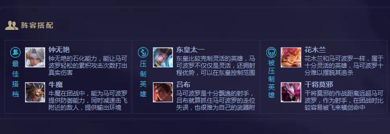 然后还有一些搭档和压制英雄,搭档基本都是一些控制性英雄,射手配合这种肯定最好的,不过这个压制英雄里面有一个东皇太一我就不是很理解了。现在的东皇太一都是带闪现的,要控到马可波罗还是比较简单,面对他还是不要太嚣张了吧。