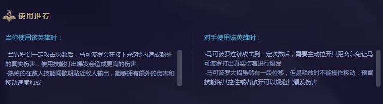 另外官方也说了一些对线技巧和针对方法,首先对线尽量让马可波罗的伤害集中打一个人。同时在确保安全的情况下可以贴身进行输出,伤害更高。而针对马可波罗就是在和他对线一段时间之后,就要拉开距离,防止真实伤害。以及他大招的过程中现在不能移动了,因此我们也可以想办法进行躲避。