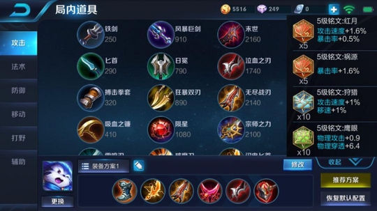 这个英雄是有两套出装的,其一是AD,另外就是AP了,不过法师装都是打后期,基本只有王者以上段位才会需要,一般大家看到的都是出攻速暴击装!前面攻速鞋,电刀,影刃都是为了能够在近身之后尽快打出伤害,而有了无尽之后那个输出更加爆炸,之后再补上泣血之刃,续航能力也是得到了满足!铭文则推荐5红月+5祸源+狩猎+鹰眼!