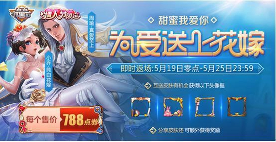 神秘商店可能会在下周周末开启,那时候刚好是520情人节,不过很多玩家想要纯白花嫁返场,这款皮肤在去年520已经返场过了,今年返场的希望不大。相比纯白花嫁而言,冰锋战神和热情桑巴更需要返场,这两款皮肤的人气更高,也从没有返场过,需要给从未返场的限定皮肤一个机会。2017年纯白花嫁返场海报如下图: