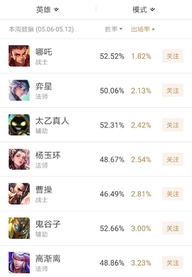 而从助手的英雄出场率看,有一些英雄似乎已经无可救药。曹操被版本舍弃之后,即使出了赛季皮肤,出场率还是垫底的存在。哪吒曾在KPL上大放异彩,但目前居然是垫底的出场率,据说这届KPL的限定是哪吒的,希望能拯救他。而奕星作为刚出不久的法师,居然也是垫底的存在,只能怪12技能的设定太过普通,AD出装被封之后,几乎无人问津了。杨玉环不再按比例计算之后,一下子就成为了弃子。太乙和鬼谷子虽然是KPL的常客,但在路人局,看到的实在太少了,因为配合难度有点大。曾经的中单一哥高渐离,已经跟不上版本节奏了,不知道什么时候能加强一波,或者回炉一波。其他还有廉颇典韦之类的,皮肤又少,出场率又低,哎,如果不是这次官方加强了典韦,我都以为官方已经忘记他了。