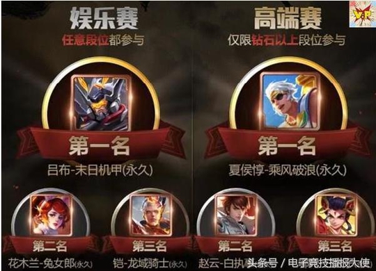 当然这两种比赛的评比规则不一样,那么相对应的奖品也是又一定的区别的,像娱乐赛的前三名奖励分别是第一名是吕布的末日机甲,第二名是花木兰的兔女郎,第三名是凯的龙域骑士,全是永久的皮肤,而且皮肤质量也是非常不错的。再来看看高端赛的前三奖励,第一名是夏侯惇的乘风破浪,第二名是赵云的白执事,第三是哪吒的三太子。相比娱乐赛来看还是高端赛的奖励更具有一定的诱惑力啊,所以想参赛的小伙伴们还是赶紧的上分吧。