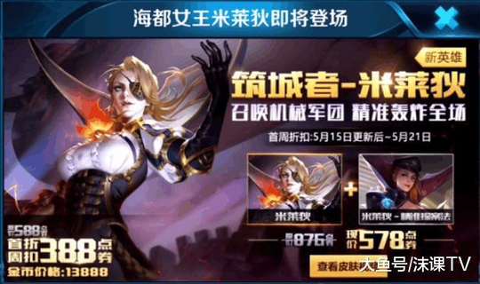 该英雄上线之后的售价为13888金币或588点卷,首周折扣价为388点卷,英雄与皮肤原价为876点卷,折扣价为578点卷。