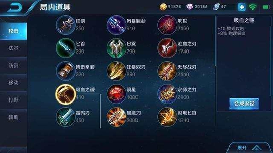 蓝色夺萃为16吸血为570。两个吸血之镰410乘以2-一把铁剑250=570。