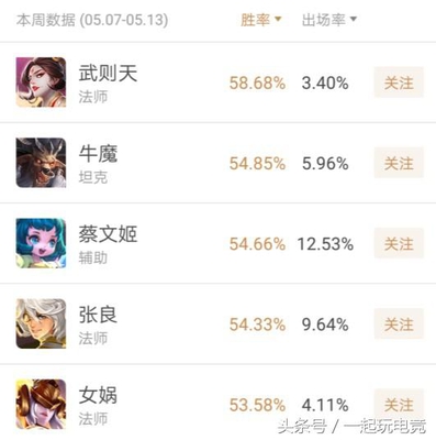 榜首大家应该已经没有期待了,毕竟在武则天面前一个能打的都没有,牛魔虽然依旧是第二的位置,但是胜率上下降了一些,榜三则有蔡文姬代替,上周表现的强势张良,掉至第四的位置,女娲则成功离开第二梯队,升至目前的第五。