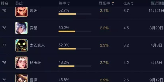 而登场率最低的英雄,最近一周分别时哪吒、弈星、太乙真人、杨玉环、曹操五位英雄,哪吒的操作比较难,虽然之前胜率达到过第二的名次,但是大招的释放还是很多小伙伴无法掌控,被人称为送财童子。弈星和杨玉环作为上赛季的长安英雄,登场率和胜率都比较低,操作比较难上手。太乙真人同样是高胜率的辅助,但是无限一技能也是少有玩家懂得运用。最后则是曹操,自从削弱一技能位移距离后,直接掉落神坛,目前的胜率和登场率都排全英雄倒数十位。